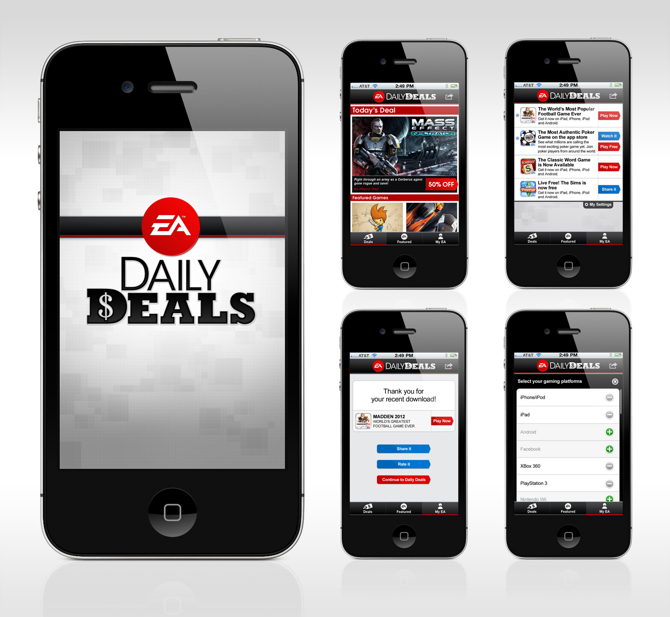 EA Daily Deals was an app dedicated to alerting and offering in-game deals on all of Electronic Arts’ portfolio of mobile games. I was tasked with creating the UI/UX for the app as well as the logo.