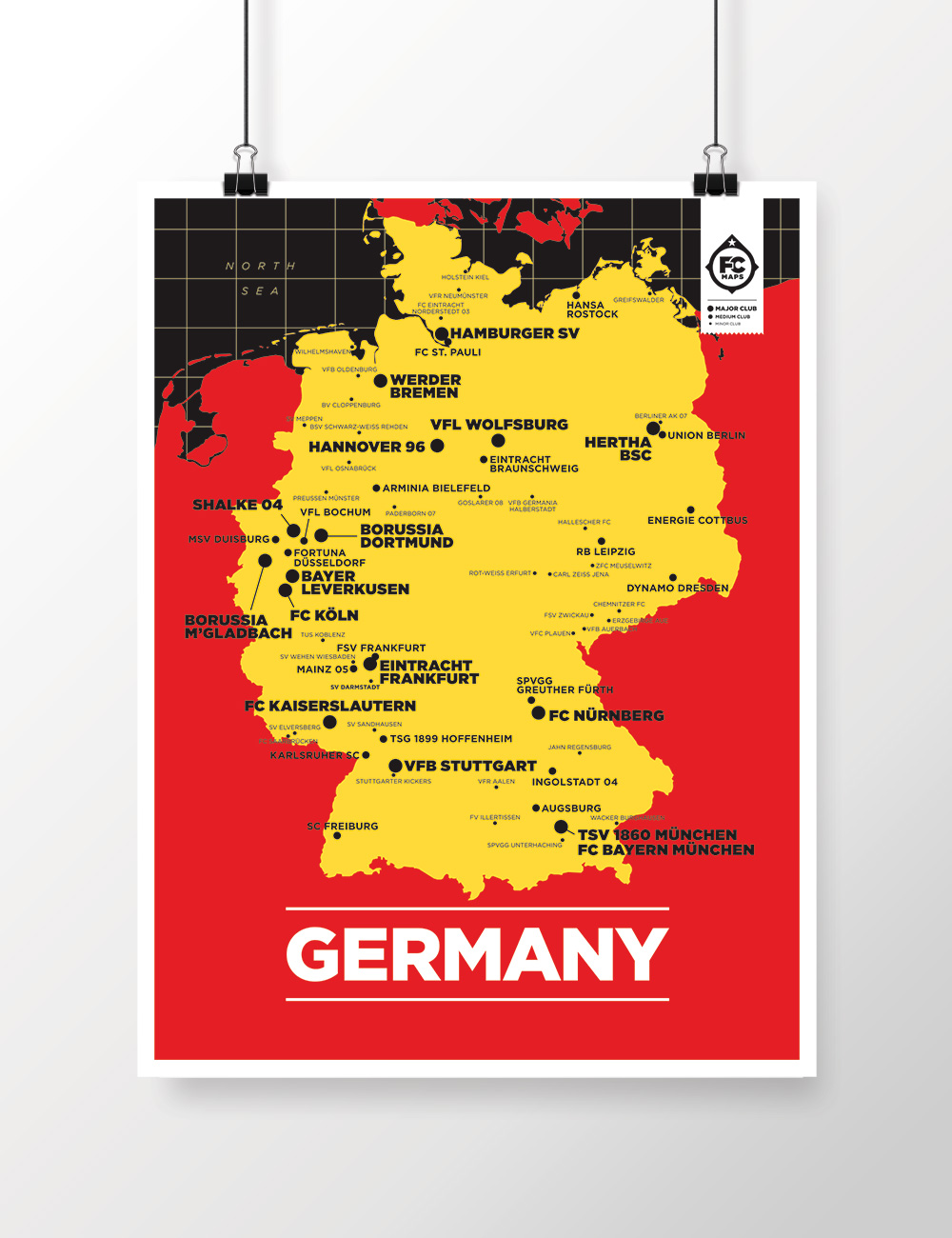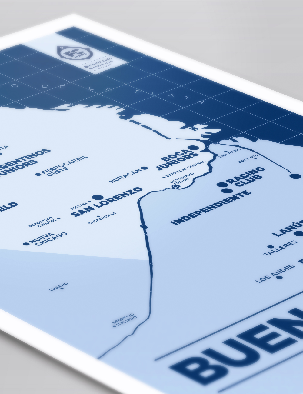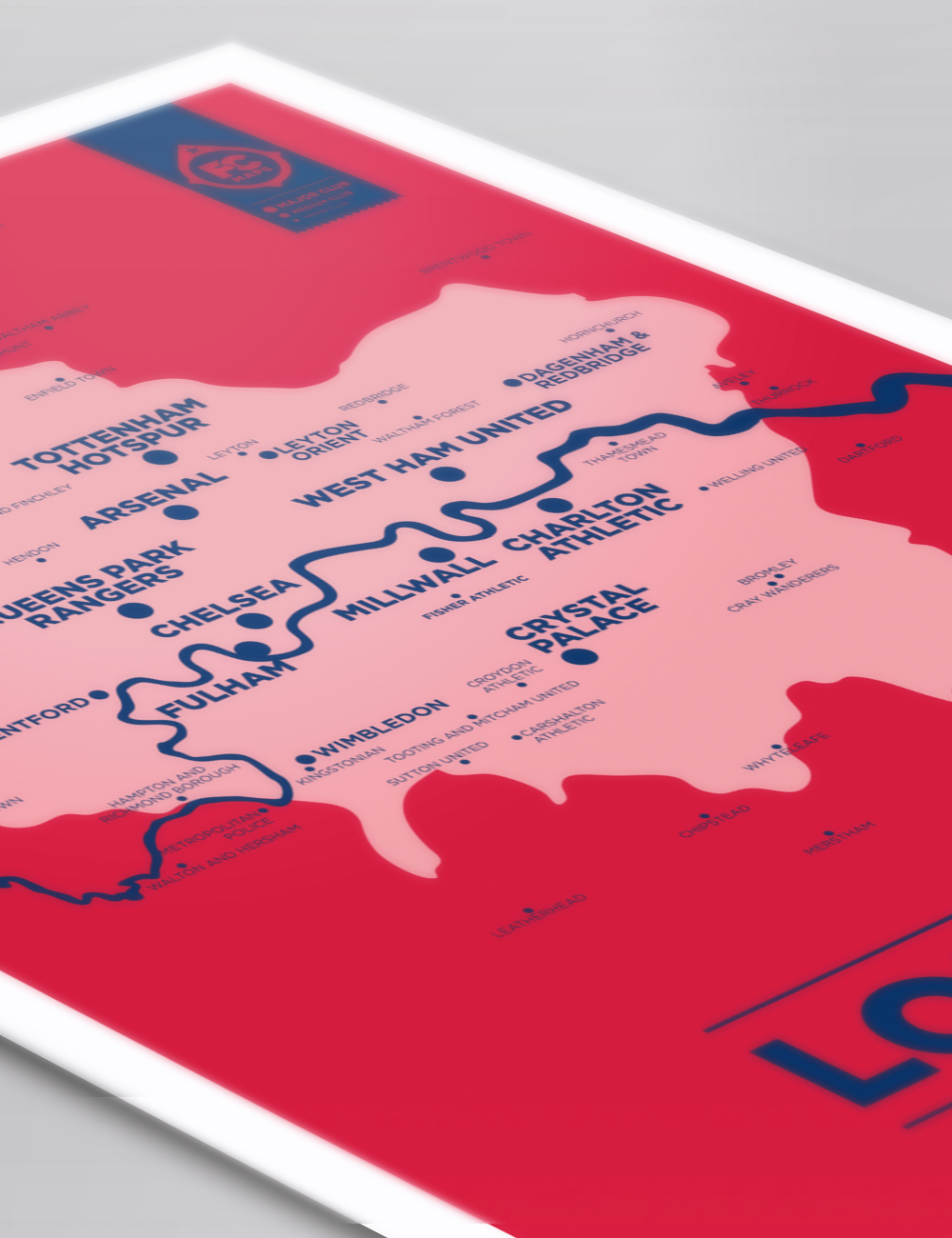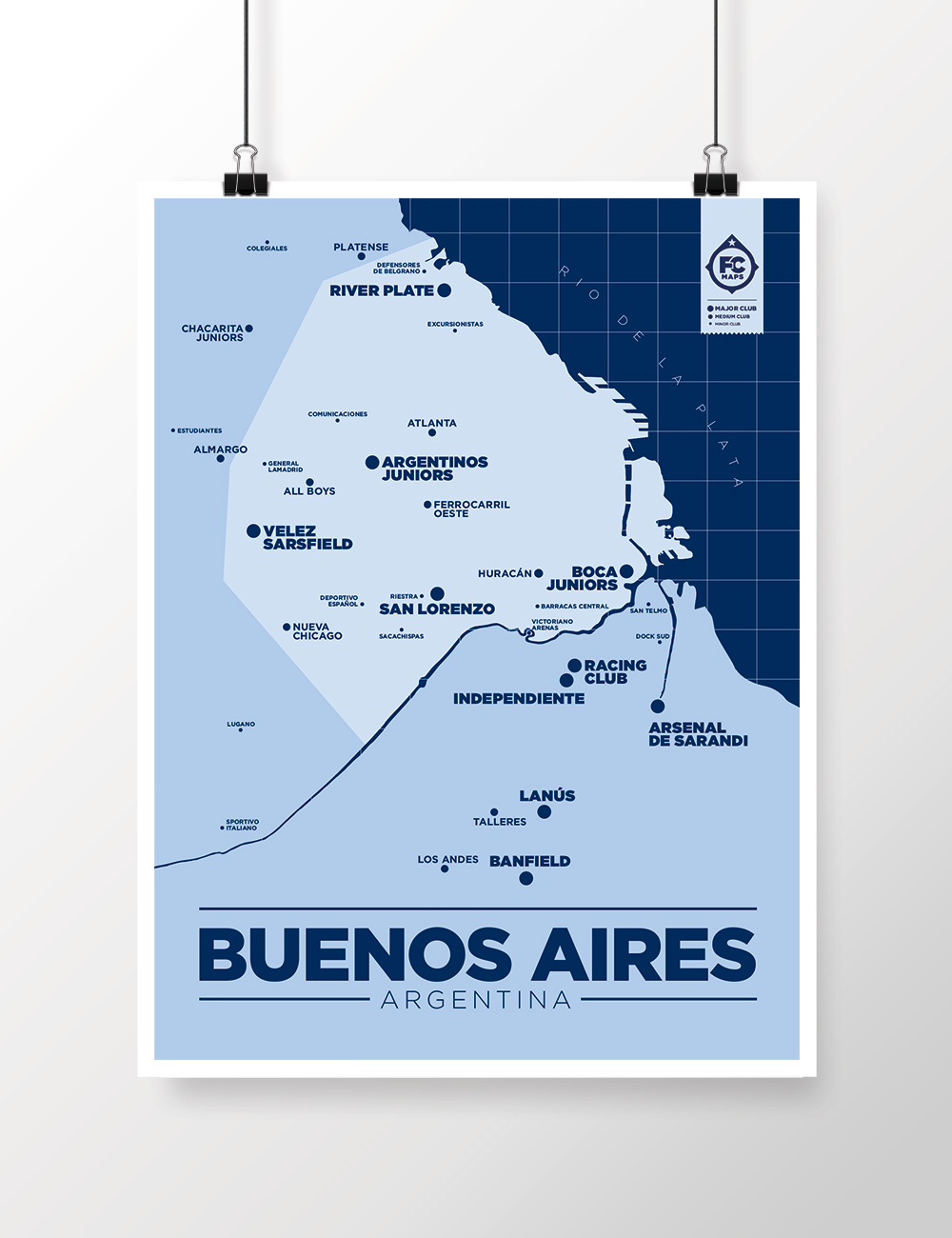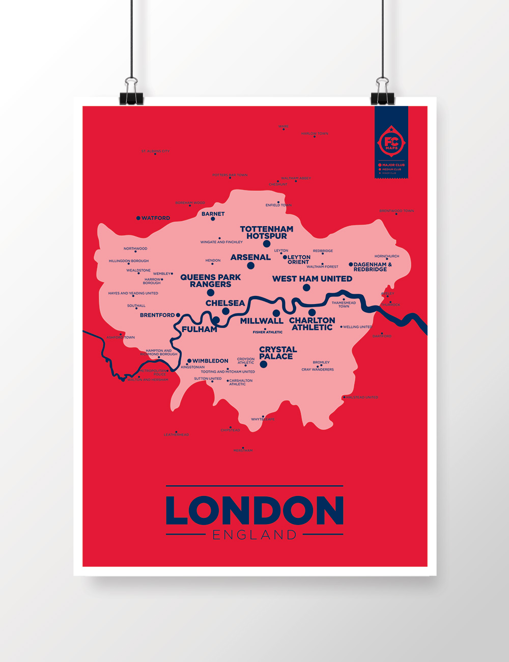 A series of posters mapping the locations of major football clubs across selected countries. Each piece required researching club histories and geographic locations, translating that information into clean, stylized map designs celebrating football culture. The posters were produced as high-quality screen prints in collaboration with a local Los Angeles print shop.