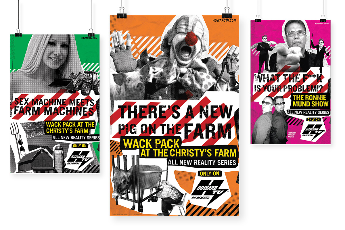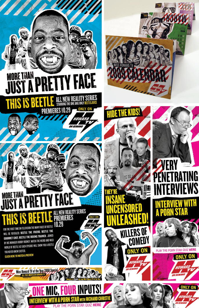 HowardTV was an on-demand cable channel that featured content from Howard Stern’s radio show as well as original shows. I was tasked with creating a design system to promote some of the upcoming shows. The crass headlines are part of the brand of the show and the colourful busy style was meant to match the shows craziness. Ads appeared in web banners, print, and OOH advertising.